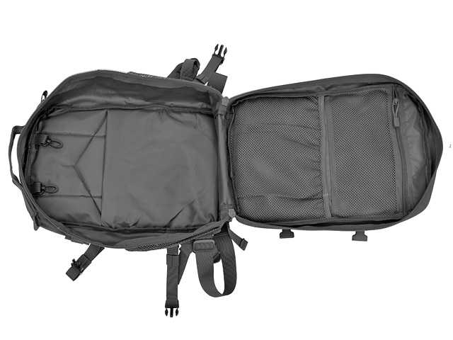 è dotato di due scomparti principali con organizer, sistema MOLLE,